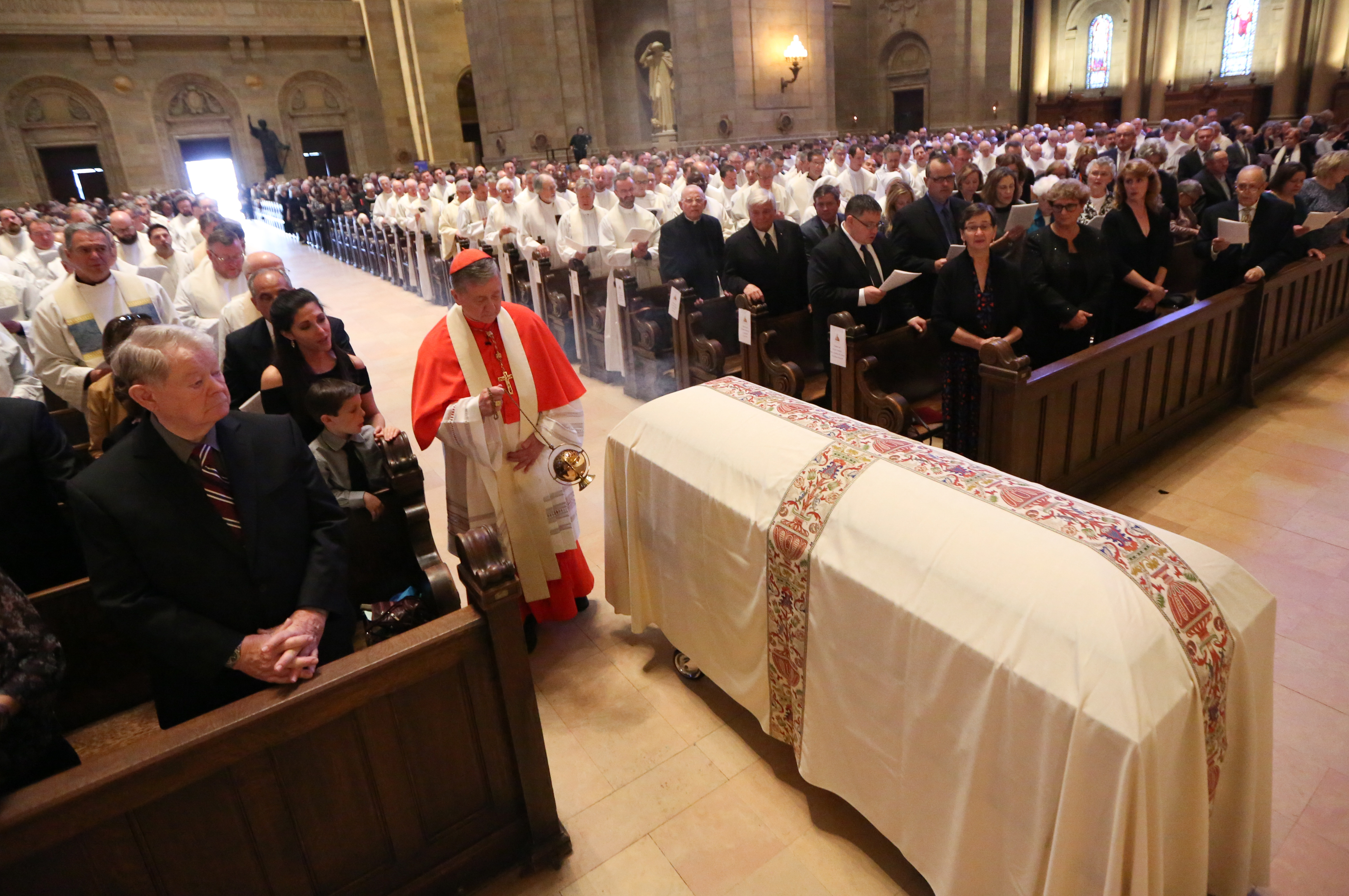 Cardinal Blase J. Cupich of Chicago swings a censer over the casket of retired Archbishop Harry J. Flynn of St . Paul and Minneapolis during his funeral Mass Sept. 30, 2019, at the Cathedral of St. Paul. (CNS photo/Dave Hrbacek, Catholic Spirit)