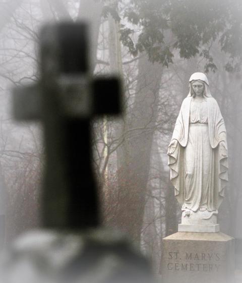 A statue of Mary and a grave marker at St. Mary Catholic Cemetery in Appleton, Wisconsin. (CNS photo/Brad Birkholz)