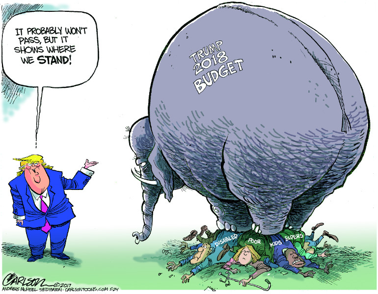 The annual budget proposal the president sends to Congress is more of a message document than a working blueprint, and the message that the Trump administration sent with its priorities on May 23 is frighteningly clear. It spells out in stark terms the Trump administration’s vision for America: It would create a crueler, more selfish society. It gives safe harbor to the richest and most comfortable among us and pits the poor and working class, families and children against the elderly to fight for scraps and leftovers. President Donald Trump would leave Social Security retirement benefits untouched, but would cut Social Security disability payments. Meals on Wheels are safe, but school lunches and food stamps are not.
