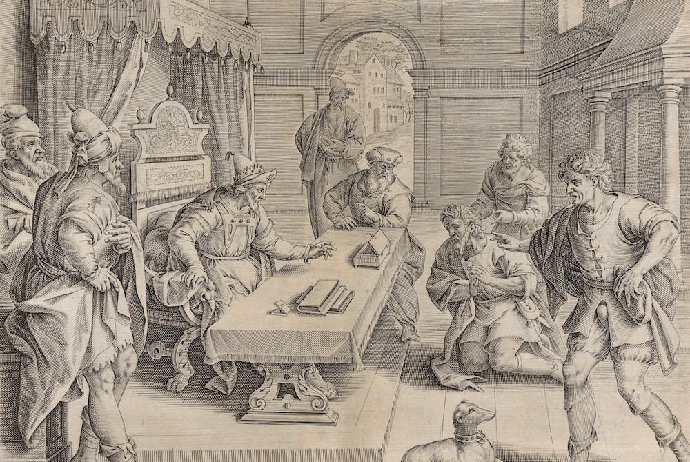 Detail of engraving of "The King Cancelling his Servant's Debt," from the Parable of the Unmerciful Servant, bound in "Thesaurus Sacrarum historiarum Veteris et Novi Testamenti," from the Netherlands, 1585 (Metropolitan Museum of Art)